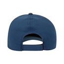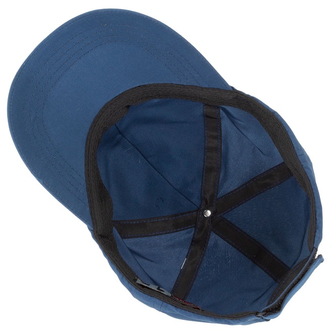 O boné é de aba curva, com fechamento strapback, além de faixa interna em tecido.