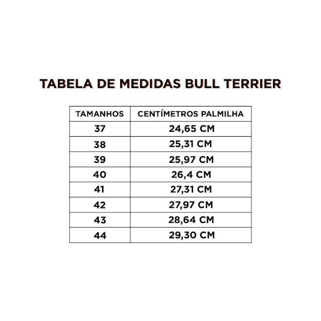A Bota Bull Terrier Legacy é produzida com matérias-primas previamente testadas dentro de rigorosos padrões de qualidade. É confeccionada com c legítimo que se adapta perfeitamente à anatomia do seu pé e permite a sua transpiração. Já o solado de borracha com excelente durabilidade garante alta resistência à abrasão, e possui ranhuras elevadas que oferecerem melhor fixação no solo. Características: -Gênero: Masculino; -Tecnologia: Power Grip; -Indicado para: Dia a Dia; -Material: C; -Fechamento: Cadarço; -Solado: Borracha; Tabela de tamanhos: 37 - 24,6cm; 38 - 25,3cm; 39 - 25,9cm; 40 - 26,4cm; 41 - 27,3cm; 42 - 27,9cm; 43 - 28,6cm; 44 - 29,3cm; Cuidados: Por se tratar de um produto em c natural legítimo, recomendamos: -Limpe somente com escova de cerdas macias ou pano; -Não utilize detergentes ou produtos químicos; -Nunca deixe de molho ou utilize a lavadora (se molhar deixe secar à sombra); -Nunca secar ao sol; -Guarde-o em locais secos, afastados de fontes de calor, solventes ou qualquer tipo de óleo; OBS: O c pode apresentar pequenas marcas, diferenças de tonalidades e texturas, o que garantem a sua autenticidade. Conteúdo da Embalagem: Contém 01 par de botas Bull Terrier.ref: M0Z8YU