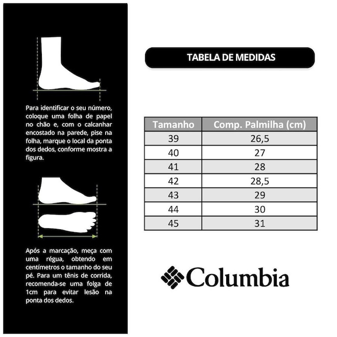 Reforço acolchoadoAltura do Cano Cano Alto Tipo de Amarração Cadarço Estampa do Logo Estampado no Cabedal Faixa Etária Adulto Garantia do Fornecedor Contra Defeito de Fabricação Conteúdo da Embalagem 1 Par SAC do Fornecedor COLUMBIA: (11) 2176-5360