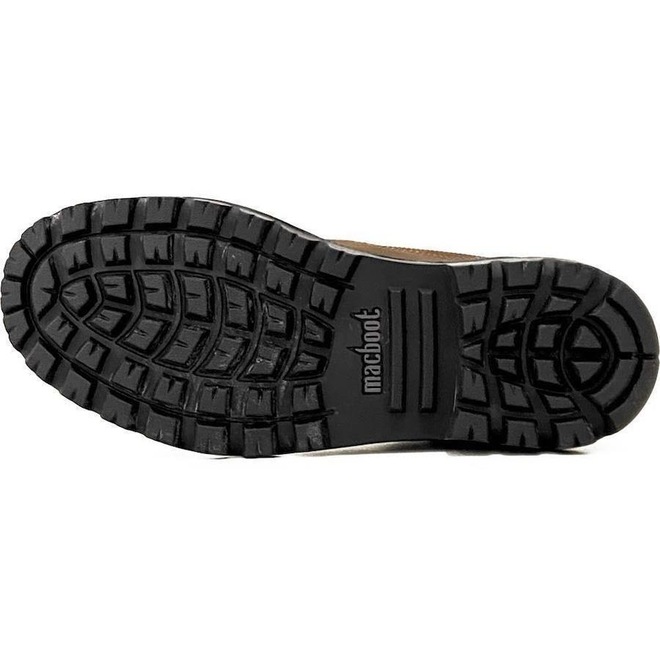 Solado - Composto por um tapete de borracha com lugs dimensionados para aderência em diversos terrenos, inclusive em terrenos lisos, onde pequenos frisos em seu desenho ajudam no escoamento da agua e garantindo o contato integral no solo.Conta com uma resistência a abrasão de 150mm³, valor este dentro da recomendação para calçados de alto uso.