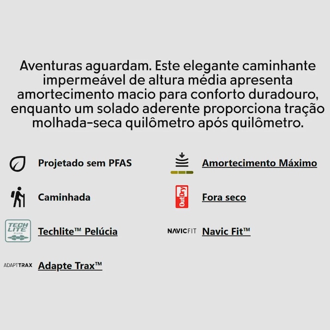 - NAVIC FIT SYSTEM™ Sistema de amarração que proporciona um ajuste perfeito para maior segurança durante sua caminhada.