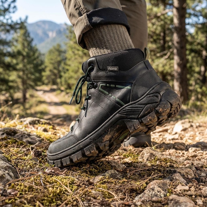 O solado tratorado proporciona tração eficiente, enquanto o cano médio dá suporte ao tornozelo.
