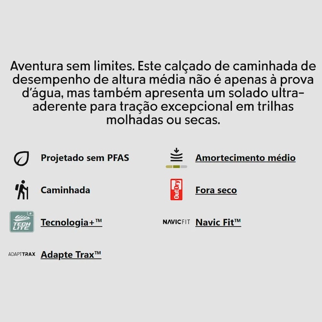 - NAVIC FIT SYSTEM™ Sistema de amarração que proporciona um ajuste perfeito para maior segurança durante sua caminhada.