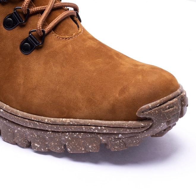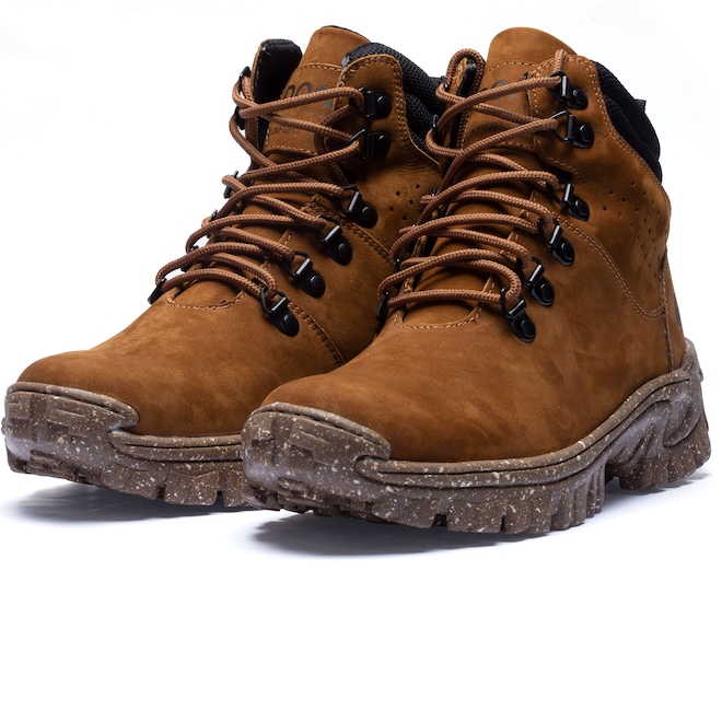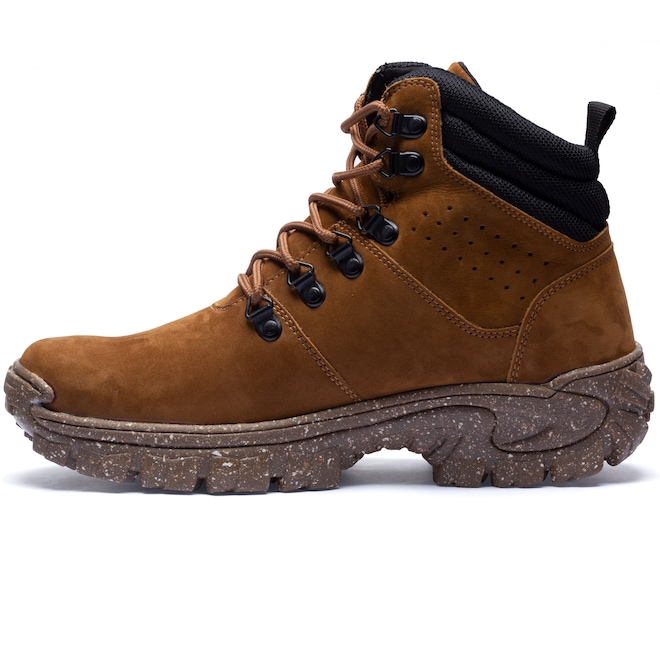 A bota masculina possui solado em borracha, proporcionando maior estabilidade e aderência em superfícies irregulares.