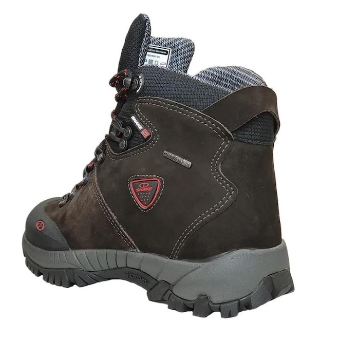 Bota com couro hidrofugado resistente à penetração de água. Tecnologia de gerenciamento térmico, ganchos articulados, estrutura de proteção em camadas e travador de cadarço.