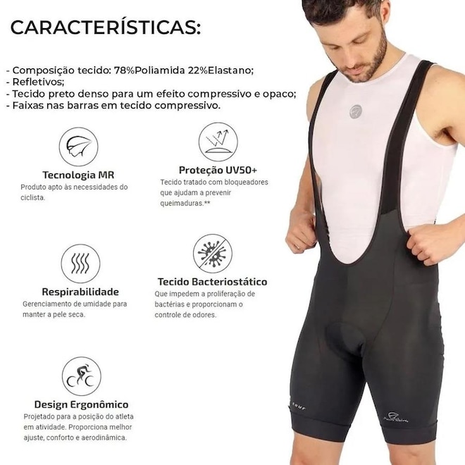 O bretelle ciclismo masculino Mauro Ribeiro Light Tour 2.0 é confeccionado em tecido composto por fibras elásticas que proporcionam a aderência e a compressão necessária ao corpo, favorecendo a diminuição das vibrações musculares durante a atividade.