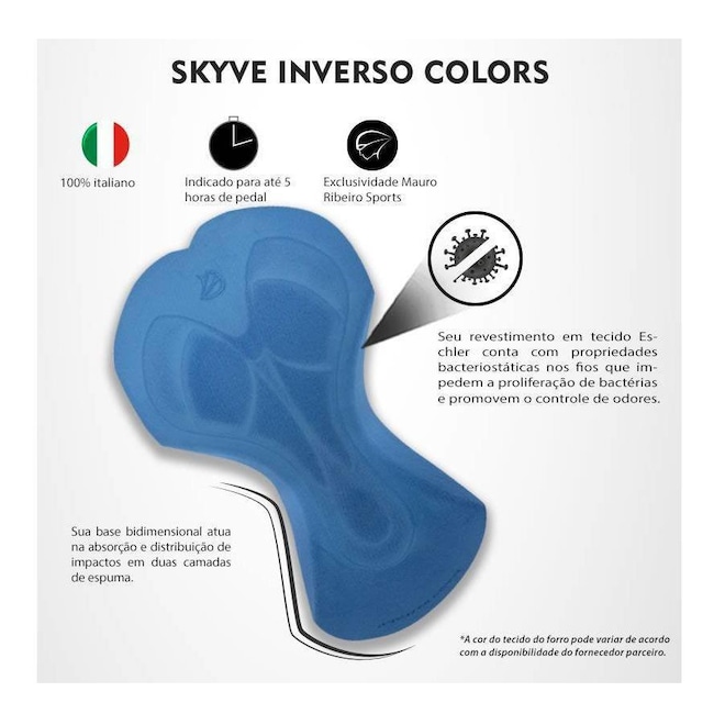 Possui design ergonômico, material 100% italiano, sem costuras e sem colas. A tecnologia Skyve Inverso presente em sua estrutura, expõe as fibras mais densas na sua parte inferior, na qual fica em contato com o selim, enquanto sua estrutura lisa encontra-se na parte superior do forro, em contato com a pele.