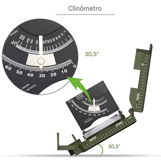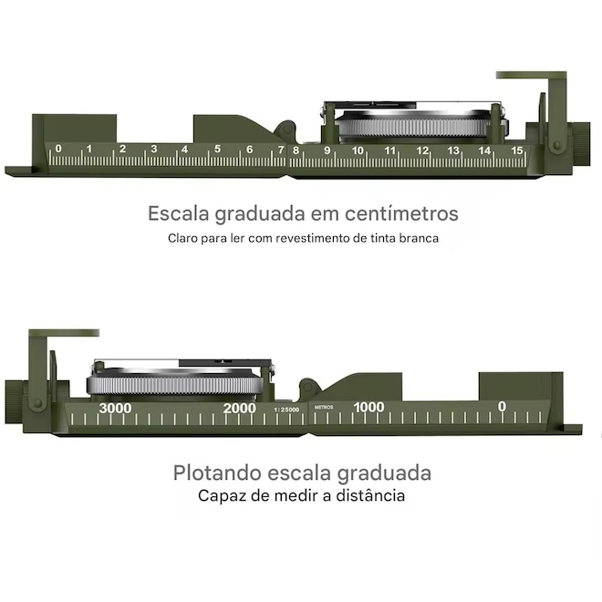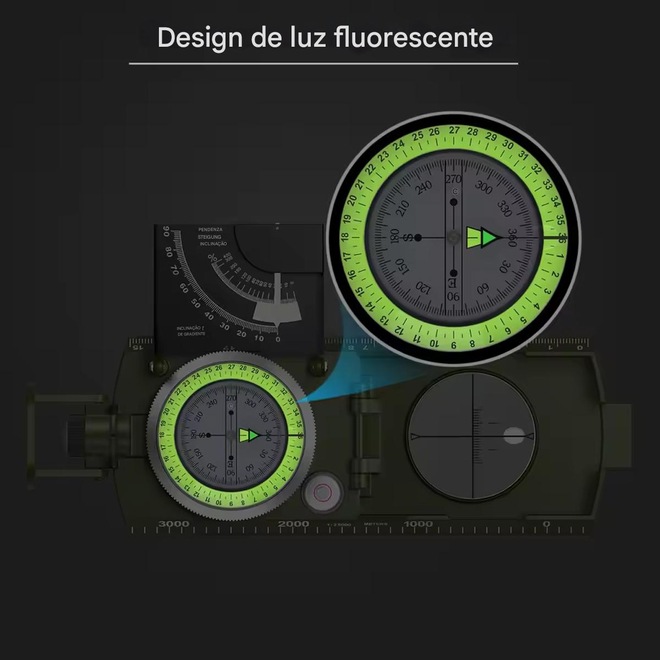 Este modelo utiliza uma verdadeira óptica de observação que permite uma leitura direta da placa de bússola interna alojada na cápsula cheia de fluido.A linha de lubrificação vertical da óptica de mira permite aproveitar ao máximo a resolução de 1 grau usada no cartão de bússola. O clinometro permite medir diferenças de altura e inclinações.Ótimo para caça, caminhadas, geologia e outras atividades ao ar livre