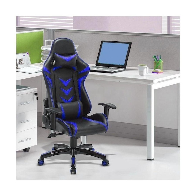 A cadeira possui encosto com sistema reclinável que vai até 180º e acompanha almofada de apoio para pescoço e lombar que garantem ainda mais conforto.