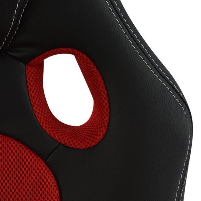 - Encosto com estrutura em madeira, estofado e revestido em couro PU e detalhes em Tela Mesh Vermelha