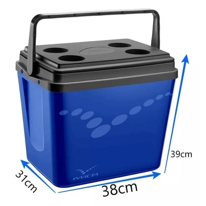 O Recipiente termoplástico Invicta possui alça nas laterais para facilitar o transporte e tampa articulada com suporte para latas, copos ou garrafas.