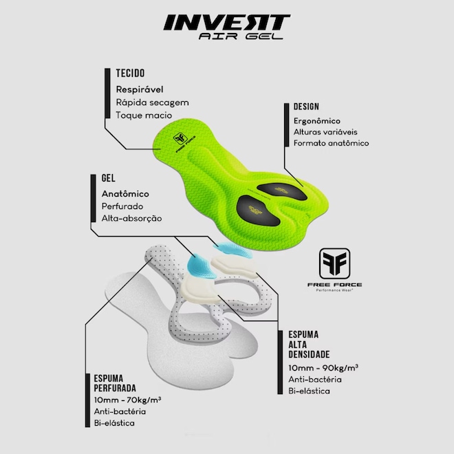 - Forro Invert Air Gel: O mais moderno forro de proteção para ciclismo. Seu relevo invertido traz o encaixe perfeito ao selim, deixando liso o contato com o corpo, evitando dobras e irritações. A variação de densidade, espumas perfuradas e placas de gel trazem um forro com altíssima respirablidade e absorção de impacto. Possui 10 mm de altura, densidade de 90 kg/m³ e é indicado para pedais de longas distâncias (recomendado para até 10 horas de pedal).