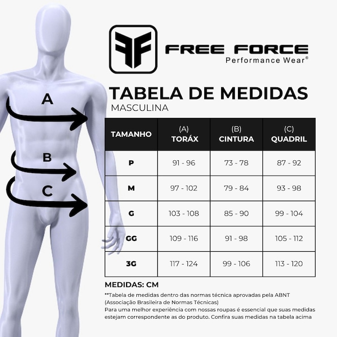 - Tamanho GG: Circunferência de tórax (109 - 116 cm), circunferência de cintura (91 - 98 cm), circunferência de quadril (105 - 112 cm)