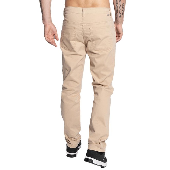 Calça Element five pockets feita em modelagem reta, fecho de botão metálico com zíper e etiquetas personalizadas.