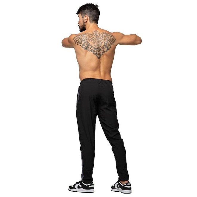 A calça possui um detalhe de faixa na lateral, elastano e bolso.