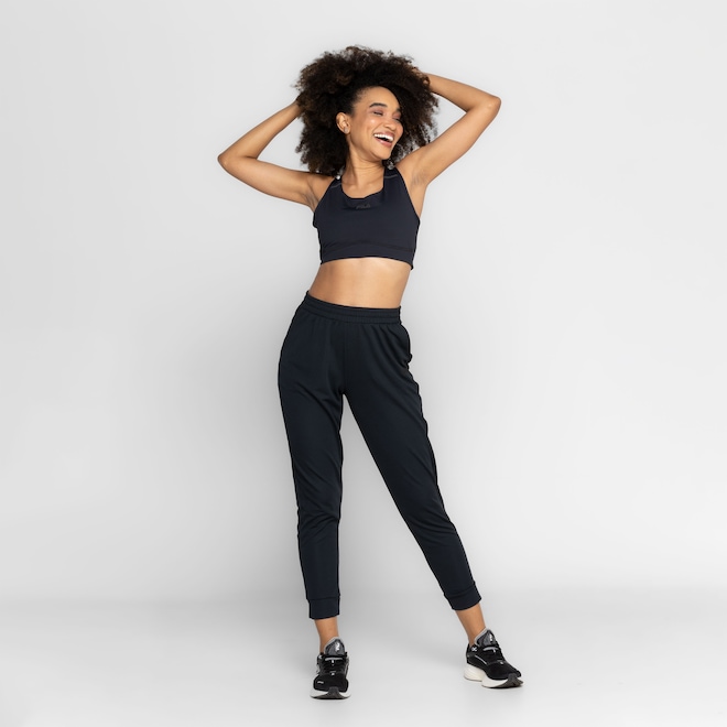 Em poliéster, oferece um caimento natural para facilitar a mobilidade durante os exercícios com cós elástico para ajuste personalizado.