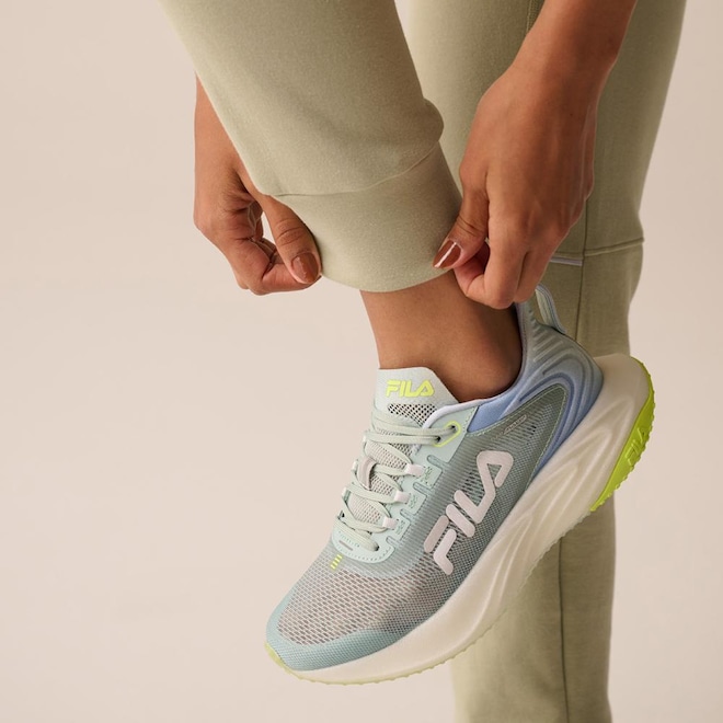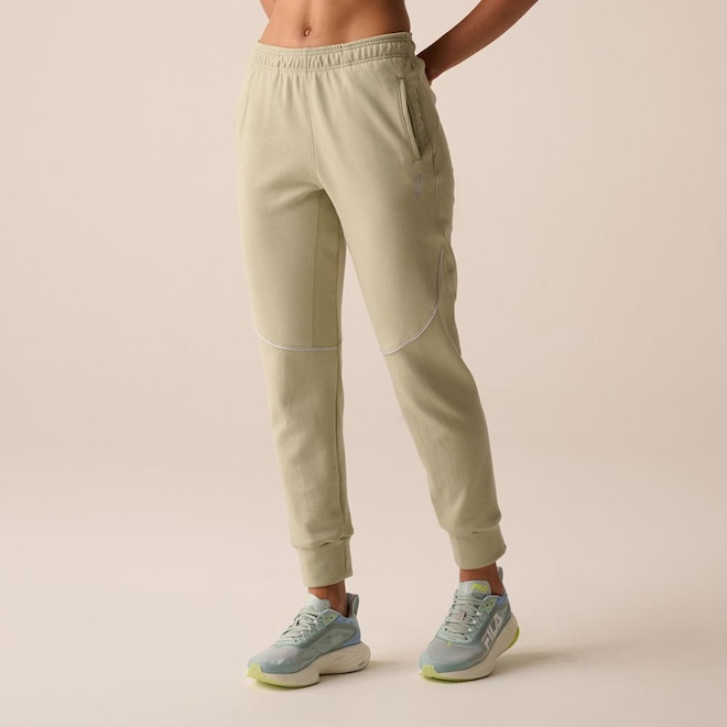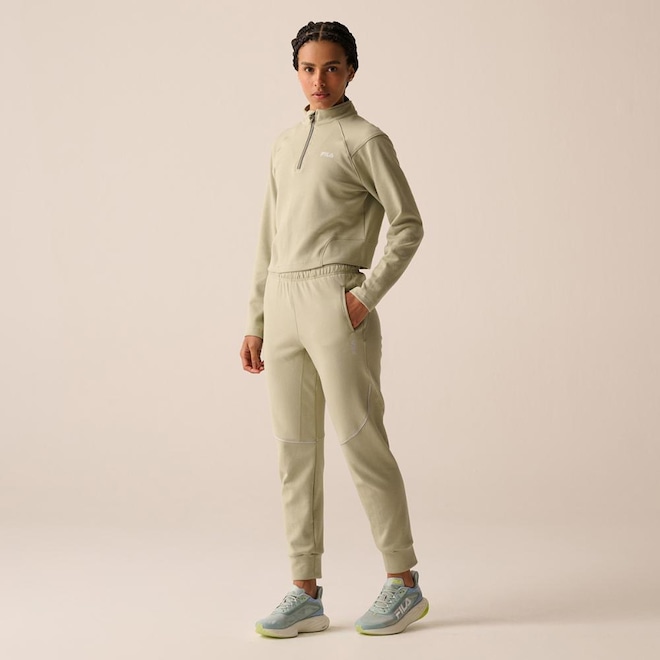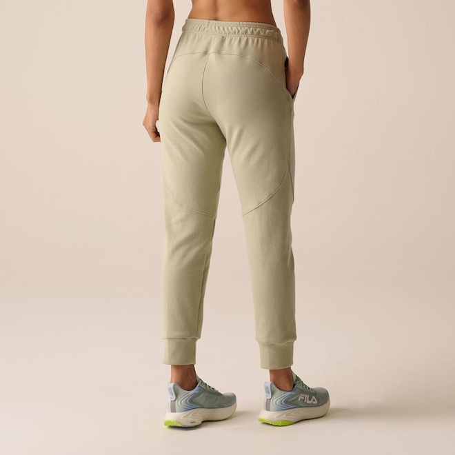 Calça feminina confeccionada em malha mista de poliéster com algodão. Modelagem jogger com cós em elástico tombado de 4 cm. Possui cordão com amarração interna no cós, bolsos laterais, gusset entrepernas com costuras Flat (sem atrito com o corpo), gancho com costura rebatida, recorte anatômico na coxa com vivos interrompidos aplicados, pala traseira anatômica, punho da barra no mesmo tecido do corpo e logo Fila Letter vertical em termo à base dágua aplicado próximo ao bolso esquerdo. Comprimento total: 96 cm.ref: M17LSX