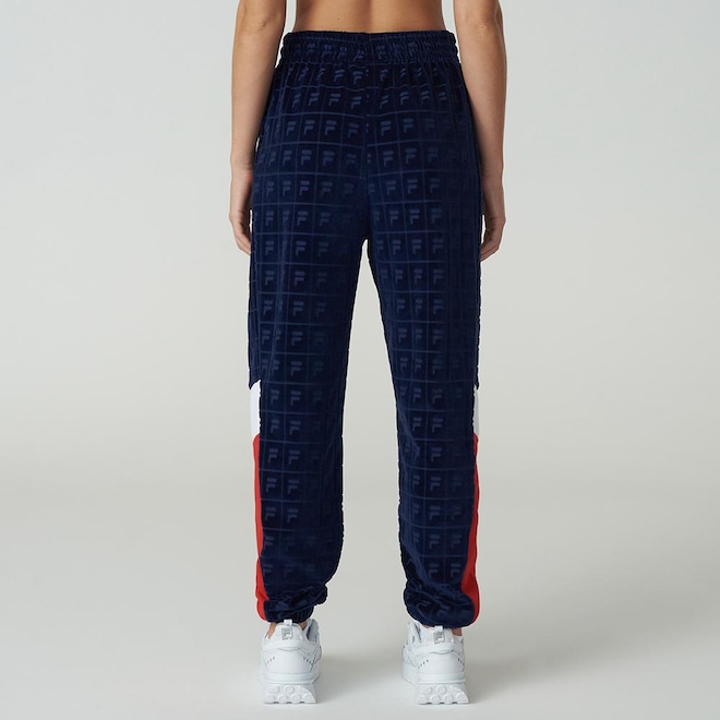 Calça feminina confeccionada em veludo de algodão e poliéster com logomania de F-Box em Jacquard. Modelagem comfort, mais solta no corpo. Possui cós com elástico interno e cordão de ajuste externo, bolsos laterais com fechamento em zíper e puxador personalizado, recortes contrastantes em tecido liso nas laterais abaixo do joelho, punhos da barra com elástico interno e patch F-Box bordado próximo ao bolso esquerdo.