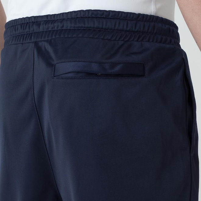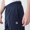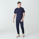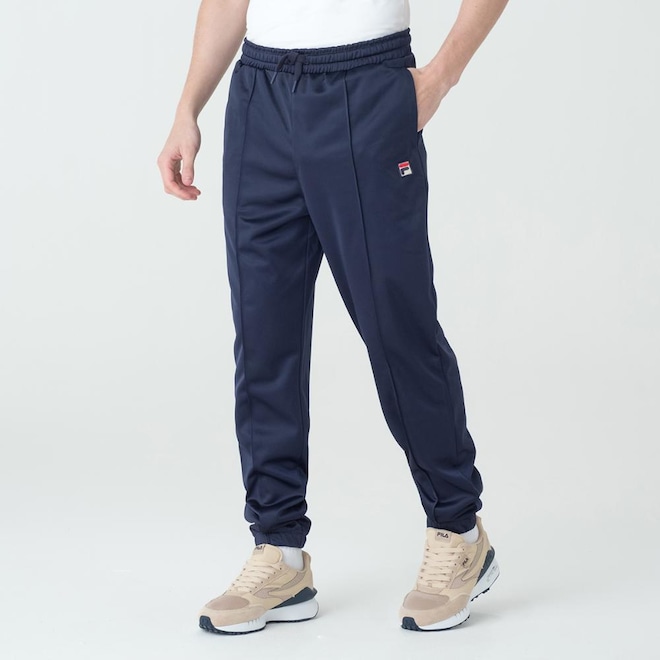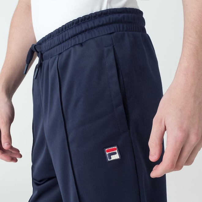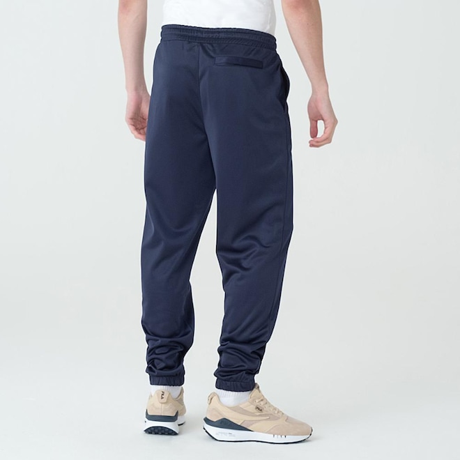Calça masculina confeccionada em tricô de poliéster. Modelagem jogger. Possui cós com elástico interno e cordão de ajuste externo, nervuras verticais na parte frontal, bolsos laterais, bolso traseiro com botão de pressão, punho da barra com elástico interno e patch F-Box aplicado próximo ao bolso esquerdo. MARINHOref: M17LT7