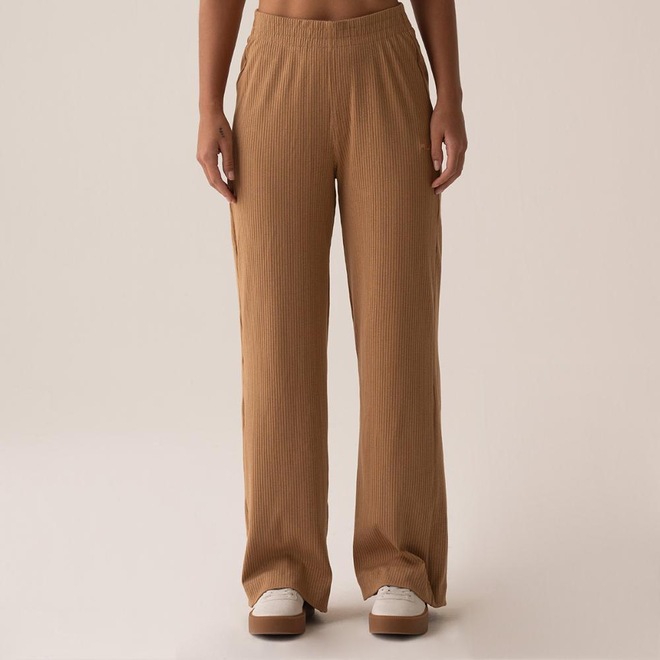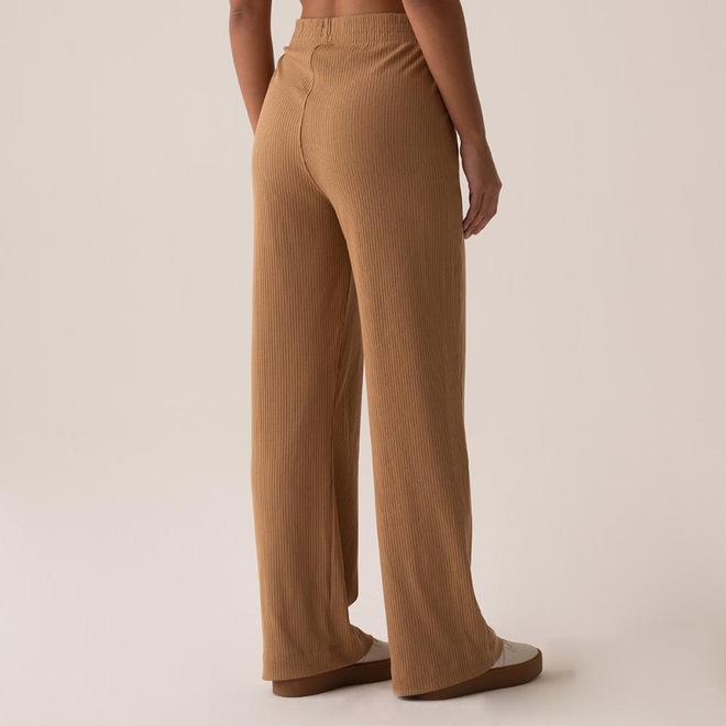 Malha Canelada Ecológica: Confeccionada em malha canelada de tecido ecológico, a calça oferece uma suavidade excepcional ao toque. O material sustentável garante que você esteja vestindo moda consciente.