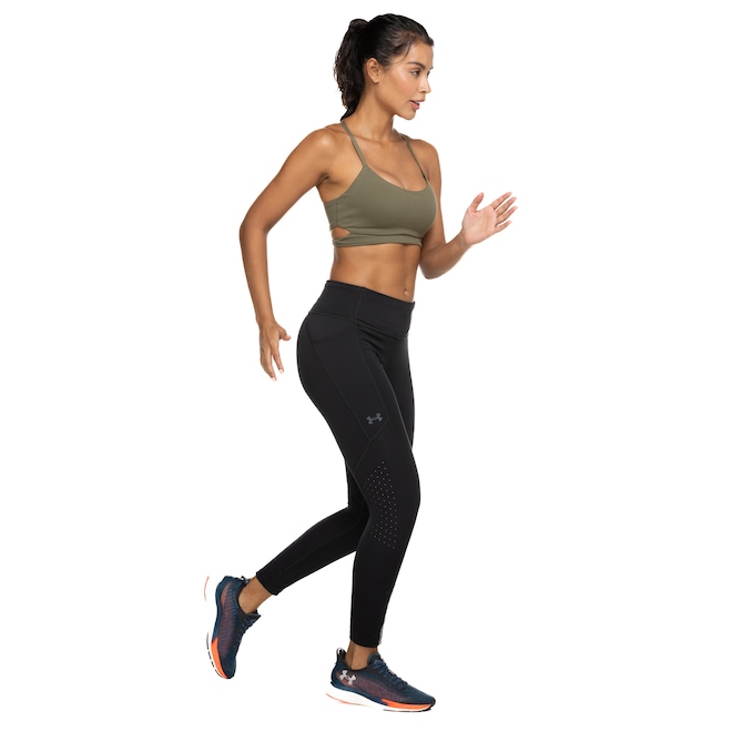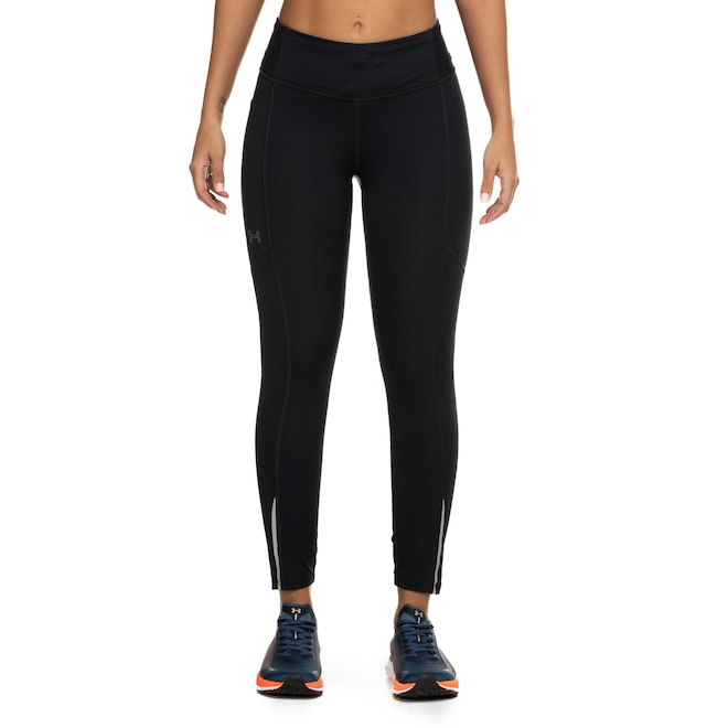A Legging Feminina Under Armour Fly Fast é de modelagem Fitted, mais ajustada no corpo, cós elástico com cordão para ajuste personalizado e cintura alta que oferece mais sustentação.