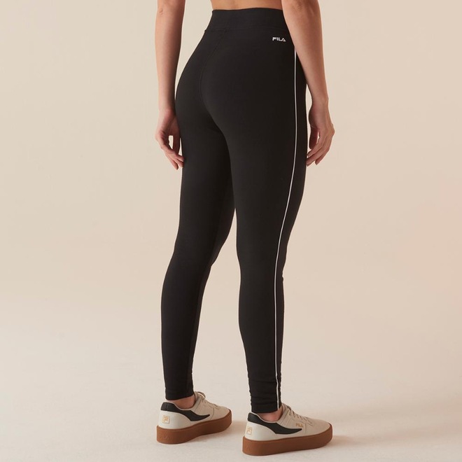 Calça Legging feminina em malha de algodão com elastano, oferece modelagem slim fit que se adapta ao corpo com conforto e liberdade de movimento. Feita com tecido ecológico, possui cós com elástico interno para ajuste firme, vivos laterais contrastantes para um toque moderno e bordado FILA Letter na parte traseira. Comprimento total: 90 cm.