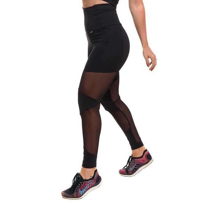 Legging em poliamida, Preta com detalhe em Tule Preto, com fator de proteção solar UV50+, Garantia de 3 meses, e contra defeito de fabricação.