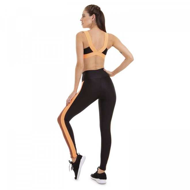 Possui detalhes com recortes misturando tecidos com efeito brilhoso e aplicação com elástico flúor.