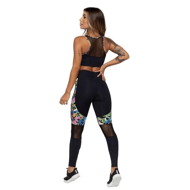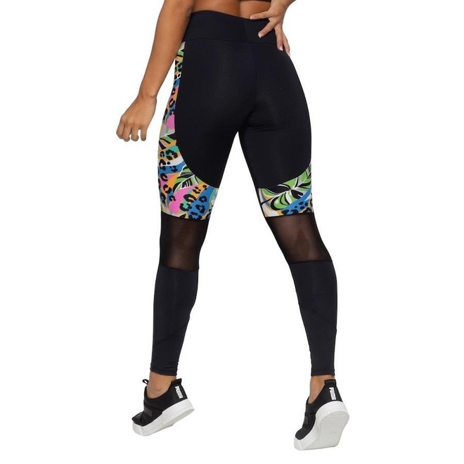 Calça Legging confeccionada em suplex poliamida de compressão com mix de tecidos liso e estampado.