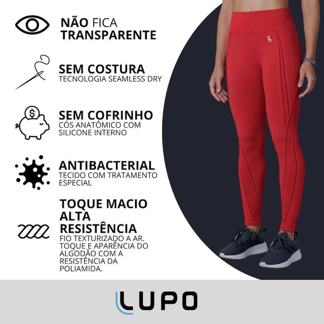 Calça Lupo Sport Legging Sem Costura Feminina - Não Fica Transparente - Seamless Dry (Sem Costura) - Borda Interna de Silicone (Sem Cofrinho) - Toque Macio e Alta Resistência - Conforto Térmico - Tecido Antimicrobial Importante: Para comprar, selecione a cor e os tamanhos desejados acima do botão "Comprar". A Calça Lupo Sport Legging Sem Costura foi pensada para otimizar a sua performance durante a prática de exercícios físicos. Possui tecnologia Seamless Dry, ou seja, sem costura que traz conforto térmico, ventilação estratégica em zonas críticas de suor. Além disso, o tecido é texturizado a ar, o que o torna macio como o algodão e com toda a resistência e qualidade da poliamida. Seu cós anatômico, possui bordas internas de silicone que evitam que a calça legging da Lupo Sport escorregue no corpo durante a prática de exercícios. Ela também não fica transparente para você ter ainda mais liberdade e conforto ao se movimentar. A altura da sua cintura é de média a alta, nas laterais conta com detalhes em alto relevo que formam linhas verticais e diagonais trazendo mais estilo a calça, seu punho é canelado gerando maior aderência da legging nas pernas. A calça legging da Lupo feminina é indicada para a prática de exercícios como corrida, academia e treinos multifuncionais. É uma ótima dica de presente para o Dia das Mães, Natal, Amigo Secreto, Aniversário. Sobre a Lupo: A Lupo é sinônimo de qualidade e tradição no mercado brasileiro. Suas peças são desenvolvidas pensando em levar conforto e bem estar para seus usuários. Sempre focada nos detalhes, as peças trazem detalhes charmosos, sempre com muita qualidade. ::Detalhes: - Marca: Lupo Sport - Modelo: 71053-001 Calça Lupo Sport Legging Feminina - Composição: Poliamida 96% e Elastano 4% - Feito no Brasil - Categoria: Calça Legging > Fitness > Feminino - Gênero: Feminina, Adulto. - Contém 1 unidade. :: Tabela de medidas: P: Manequim 36 a 40, Cintura 60 a 69 cm, Quadril 88 a 98 cm, Peso Médio 47 a 57 kg M: Manequim 40 a 42, Cintura 70 a 79 cm, Quadril 99 a 109 cm, Peso Médio 58 a 68 kg G: Manequim 44 a 46, Cintura 80 a 89 cm, Quadril 110 a 120 cm, Peso Médio 69 a 79 kg GG: Manequim 48 a 50, Cintura 90 a 99 cm, Quadril 121 a 131 cm, Peso Médio 80 a 89 kg XG: Manequim 52 a 54, Cintura 121 a 131 cm, Quadril 132 a 142 cm, Peso Médio 91 a 115 kg :: Dúvidas Frequentes - Enviamos em até 1 dia útil - Produto Original - Com Nota Fiscalref: M0ZY2J