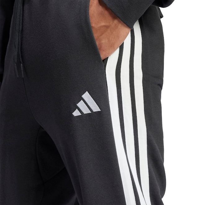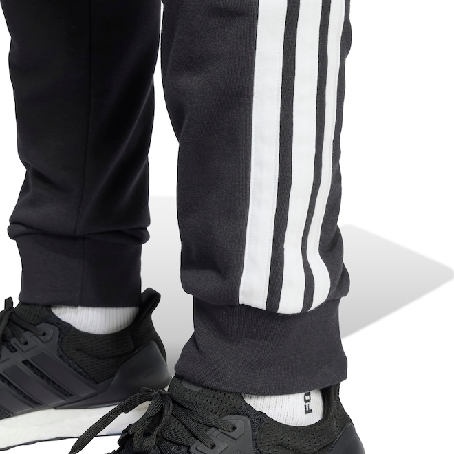 A Calça adidas French Terry 3 Stripes apresenta um regular fit que proporciona um caimento natural e confortável, ideal para o dia a dia.