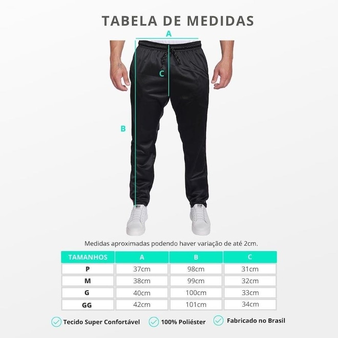 A Calça esportiva é confeccionada com tecido de poliéster leve e aconchegante, seu interior é felpado, tem toque macio, fácil de lavar, secagem rápida e não precisa passar.
