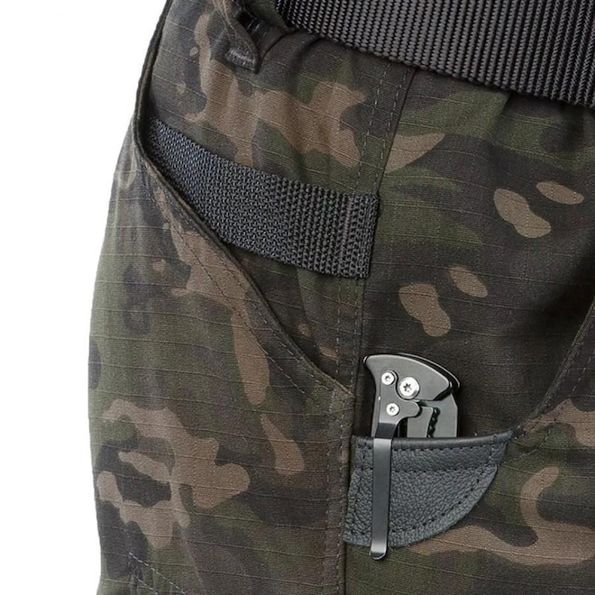 - Os bolsos principais recebem acabamento em couro legi´timo pro´prio para uso de canivete com clip.