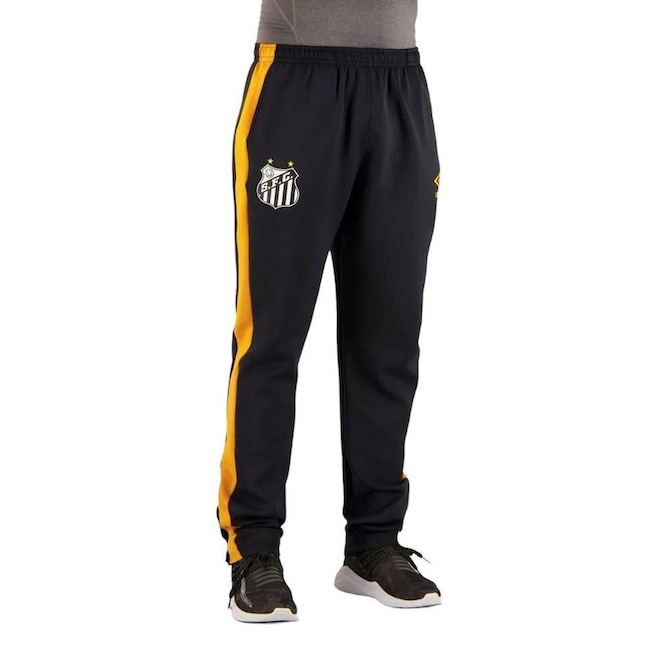 O design vem na cor preta e traz em destaque o escudo do Santos na perna direita.