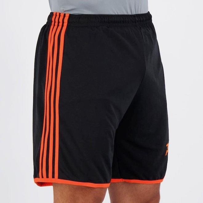 Seu design é predominantemente preto com detalhes em laranja, vistos nas listras laterais, na barra e no logo da marca fornecedora, bordado na perna esquerda.