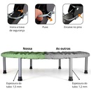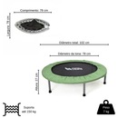 Características: 36 molas de aço de 8 cm cada, 6 pezinhos de 19 cm cada, altura do trampolim é de 22 cm e peso do produto é de 7 kg.