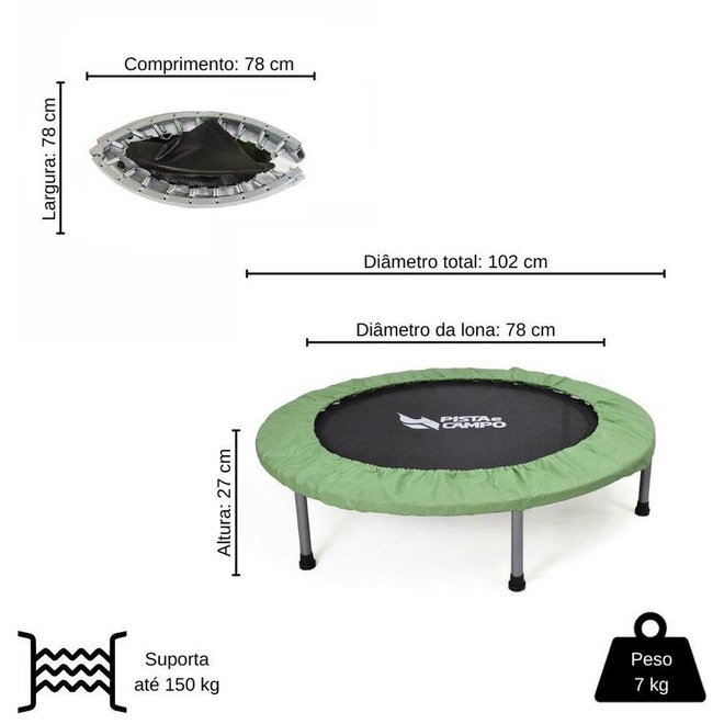 mini bands Pista e Campo. ? Altura do produto: 22 centímetros. ? Número de molas / faixas: 36 ? Forma: Redondo ? Capacidade máxima de peso 150 kg. ? Diâmetro total: 102 cm. ? Diâmetro da lona: 76cm. ? Comprimento da mola (polegadas): 8 cm. ? 6 pezinhos de 19 cm cada. ? Peso do produto é de 7 kg. CONTEÚDO: ? 01 Cj.