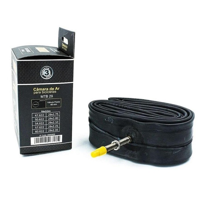Possui válvula presta de 48 mm e compatibilidade para aro 29 e largura de pneu entre 1.75/2.35.