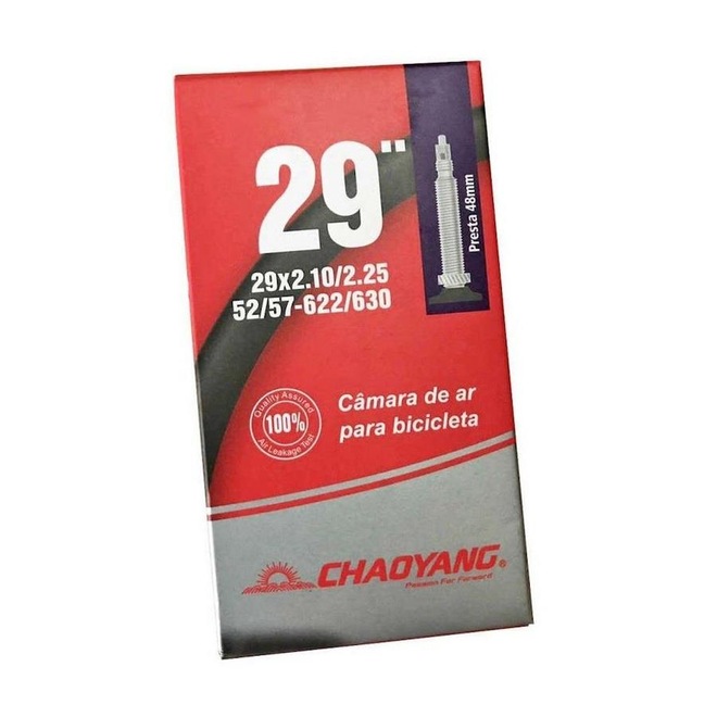 A câmara de ar Chaoyang 29 x 2.10/2.25 tem ótima resistência e elasticidade, possui válvula presta (bico fino) de 48 mm e compatibilidade para aro 29 e largura de pneu entre 2.10/2.25.