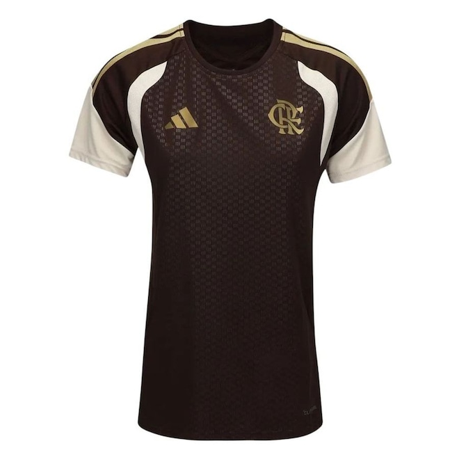 Com design marcante em tons de marrom e bege, detalhes dourados e as clássicas três listras nos ombros, a peça traz o escudo do Flamengo em destaque no peito, reforçando a identidade do clube. Ideal para treinos, academia ou para demonstrar seu amor pelo Mengão com performance e estilo.