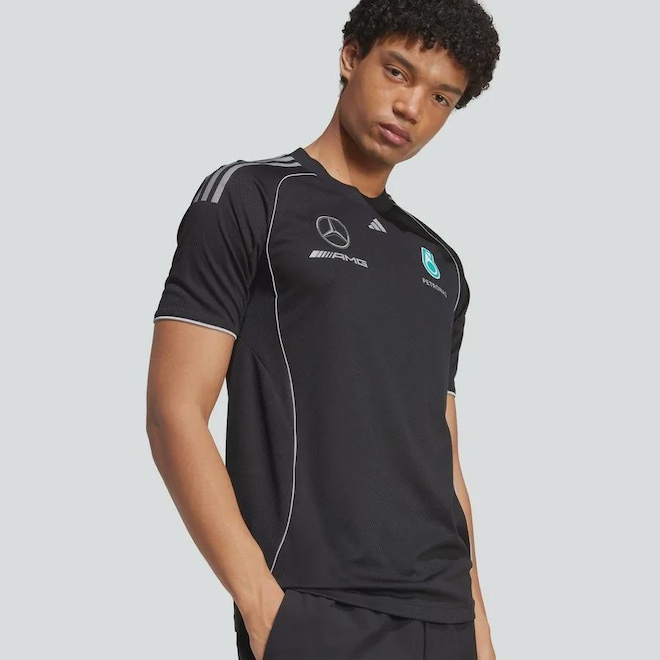 Não são apenas os pilotos que precisam estar bem vestidos no dia da corrida. Esta camisa da adidas Motorsports é idêntica àquela usada pelos mecânicos da equipe, que garantem que o carro da Mercedes - AMG Petronas esteja sempre pronto para a ação. Os logos da equipe no peito, as Três Listras nos ombros e as Três Barras no peito garantem um visual autêntico, enquanto o tecido AEROREADY controla a umidade para uma combinação máxima de desempenho e conforto. Este produto é 100% feito com materiais reciclados. Ao escolher o reciclado, podemos reutilizar materiais já criados, o que ajuda a reduzir o desperdício e a nossa dependência de recursos finitos, além de reduzir a pegada dos produtos que fabricamos.