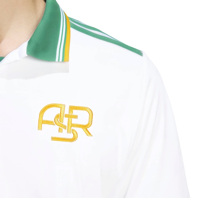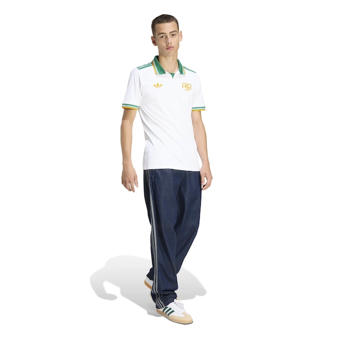 O emblema do clube aparece em destaque no peito ao lado do icônico Trefoil da adidas, reforçando o estilo e a tradição.