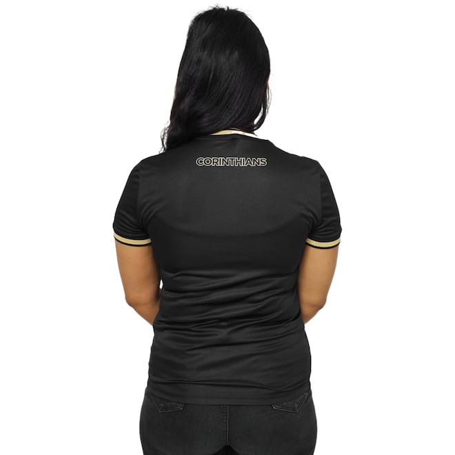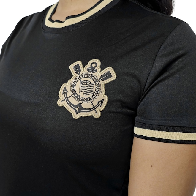 Predominantemente preta, essa peça se destaca pelos detalhes em dourado na gola careca e nas mangas curtas, conferindo um toque de sofisticação ao visual. O grande diferencial fica por conta do escudo bordado, que dá autenticidade e reforça o orgulho corintiano com muito charme.