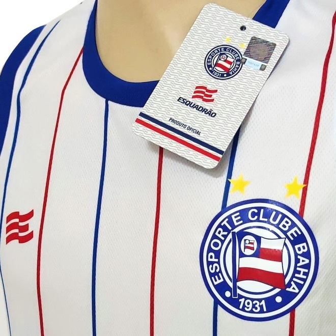 Produzida em 100% poliéster leve e respirável, a peça conta com um design ousado e moderno, na cor com listras em e , nas tradicionais cores do tricolor baiano, conta com o escudo do Bahia estampado do lado esquerdo do peito.