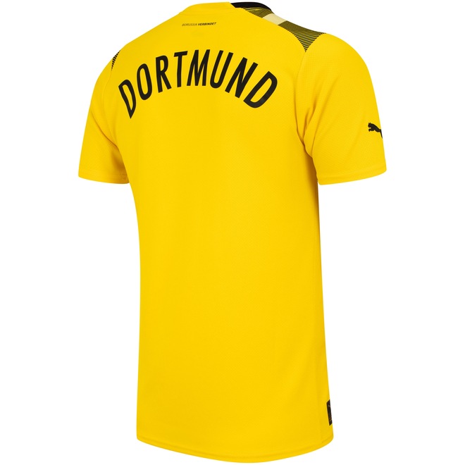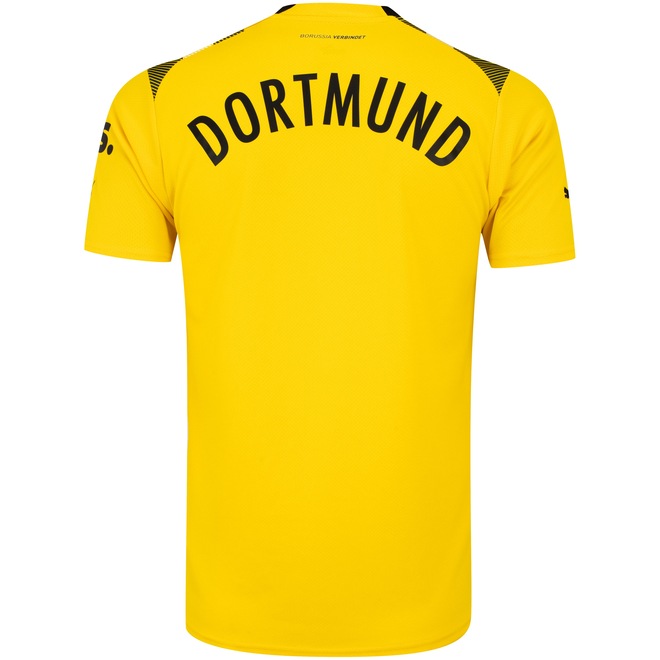 A camisa Borussia Dortmund 22 tem mangas curtas, sua gola é careca, canelada e tem tira interna que protege do atrito junto à pele e a autenticidade é estampada.