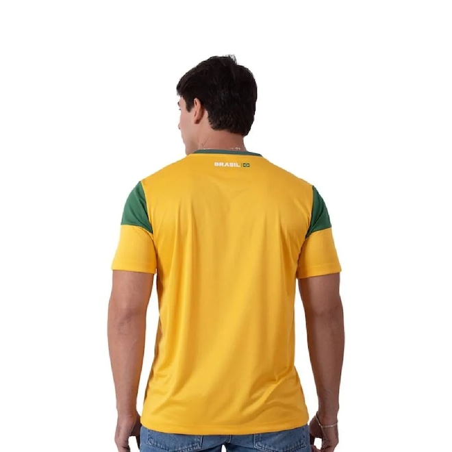 A estampa frontal da bandeira do Brasil transmite orgulho nacional, enquanto o escudo estampado complementa a identidade da camisa com personalidade. As mangas e gola em tons contrastantes dão aquele toque extra de estilo que eleva o visual, seja nas arquibancadas ou no cotidiano.