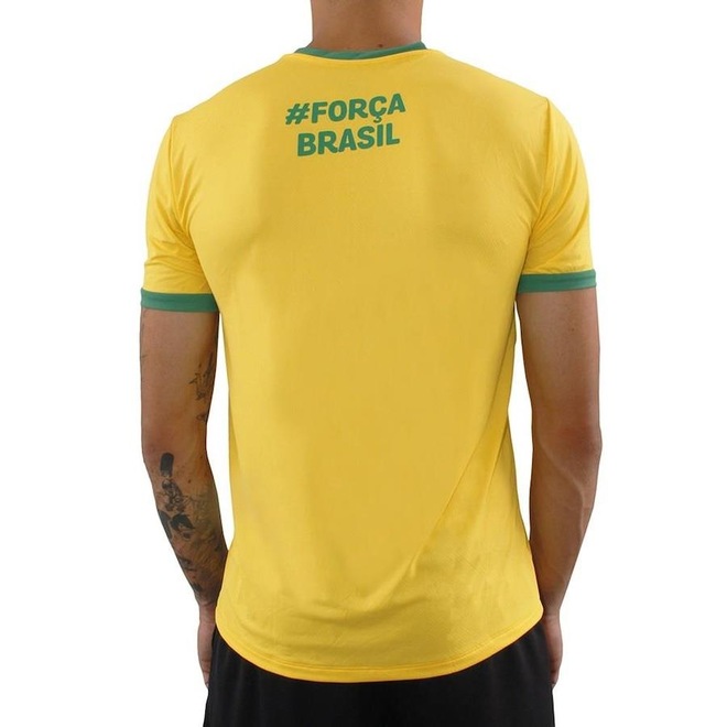 O design vem na cor amarela com detalhes em verde e traz a logo da marca Esporte Legal estampada do lado esquerdo do peito e em destaque, na parte de trás, a frase FORÇA BRASIL em apoio a seleção Brasileira.