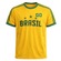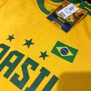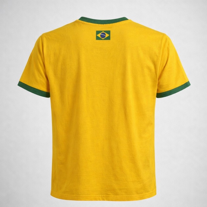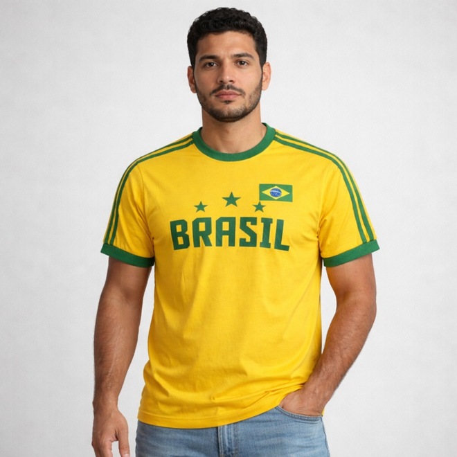 O modelo apresenta o icônico visual amarelo com detalhes em verde, além da estampa frontal “BRASIL” com três estrelas, que reforça a tradição e a história da seleção. No peito, a peça conta com a bandeira do Brasil aplicada em patch, trazendo mais autenticidade e destaque ao design. A camisa possui gola redonda com acabamento em verde, proporcionando um caimento confortável e estilo esportivo clássico. As listras verdes nos ombros e os punhos contrastantes nas mangas complementam o visual, criando um design moderno com inspiração retrô.