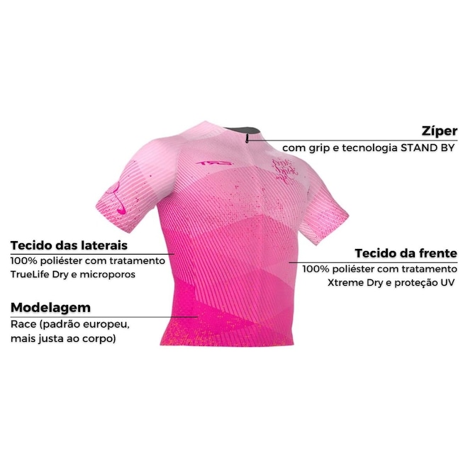 - Tecido das costas e mangas: 86% microfibra de poliéster e 14% elastano com a função de moldar-se ao corpo em qualquer situação. Conta com tratamento TrueLife Dry, bactericida e proteção UV +50.