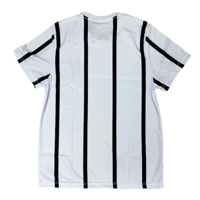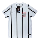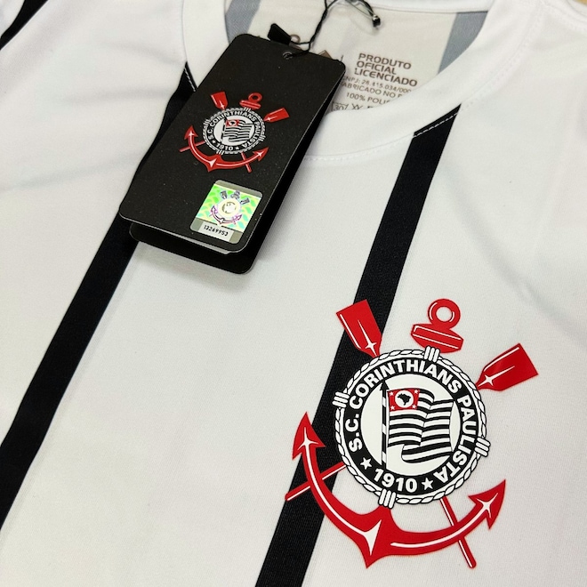 A peça é a tradicional camisa do Corinthians na cor branca com listras na vertical, produzida em 100% poliéster leve e escudo estampado no peito.